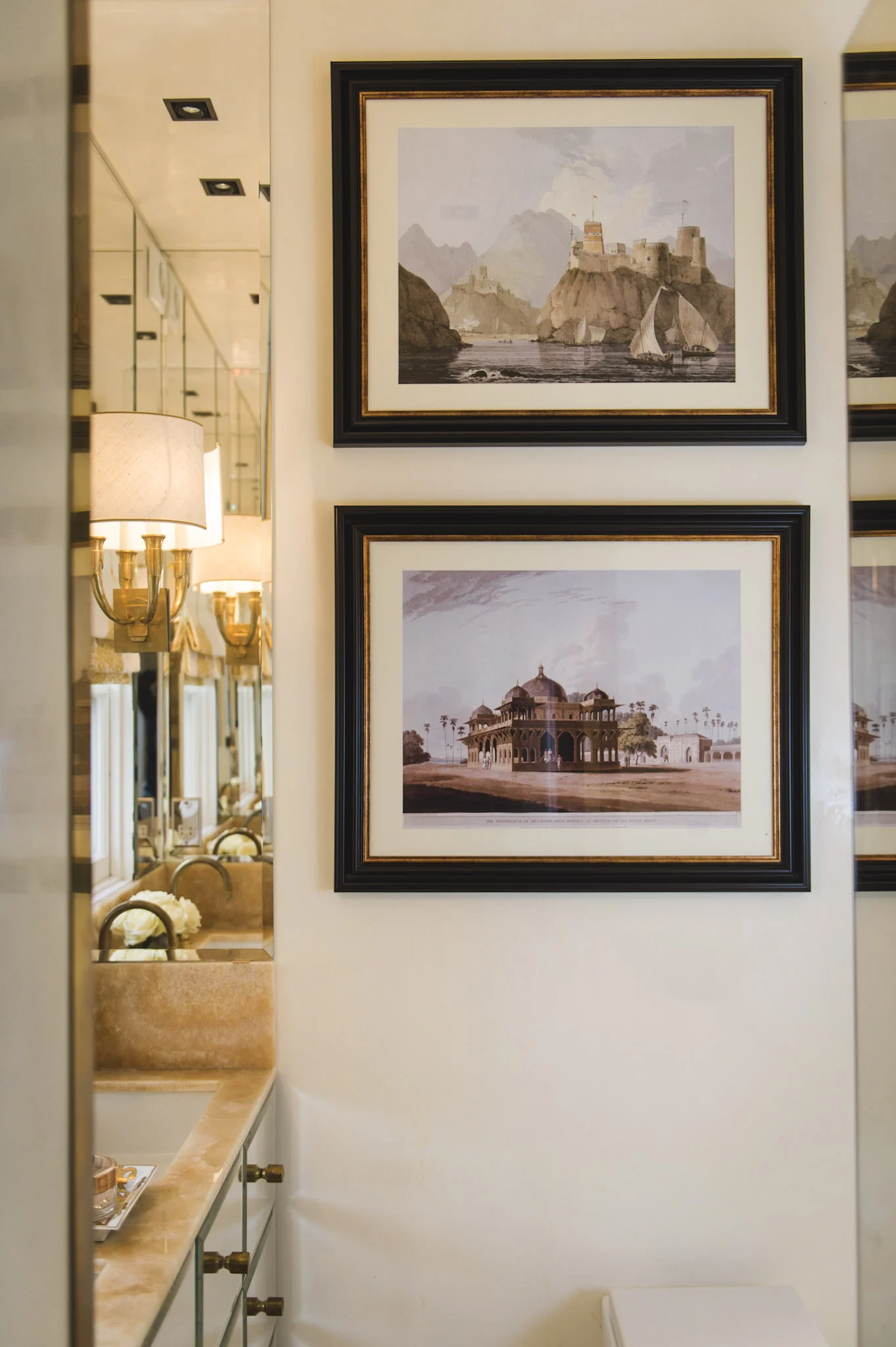 Inspired by her favorite London hotels, the master bedroom combines functionality and old-school glamour with a palette of restful caramels and golds. A partially mirrored wall divider acts as a handy storage and dressing area.